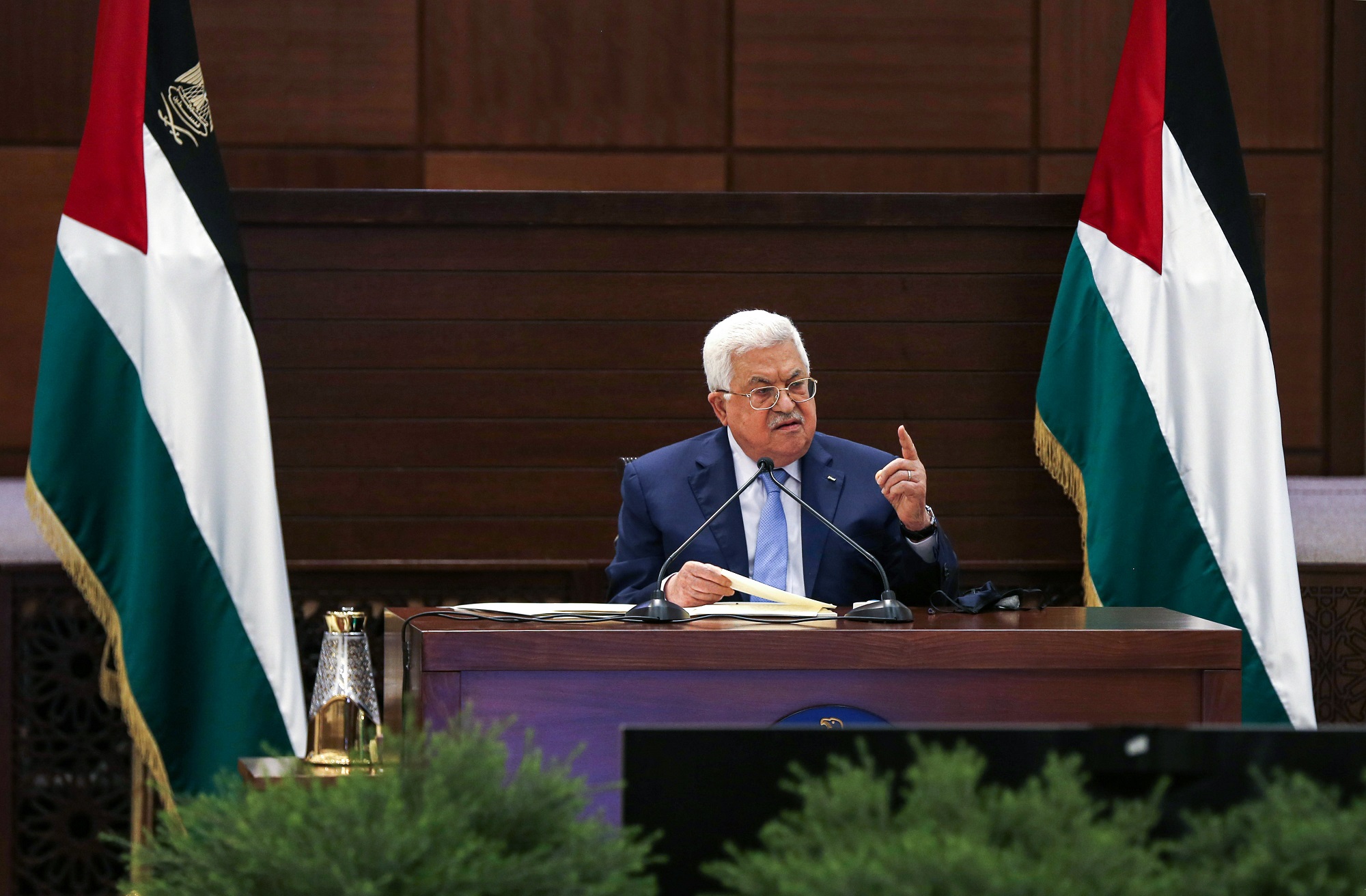 Palestinian President Mahmoud Abbas speaks during a rare meeting of rival Palestinian factions, 3 September 2020 (AFP)