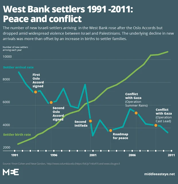Noticeably, rather than halt or reverse the expansion of the settlements during the supposed five-year transition period, Oslo allowed the settler population to grow at a dramatically accelerated rate.