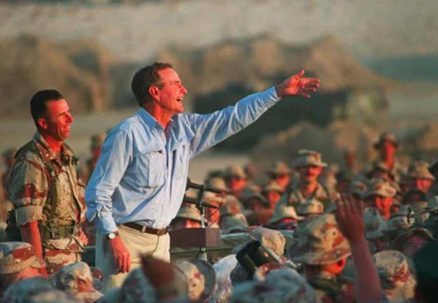 Fearing that Saddam Hussein would go into Saudi Arabia after occupying Kuwait in 1990, Bush launched an international coalition against the Iraqi leader and bided his time by amassing US troops inside Saudi Arabia.