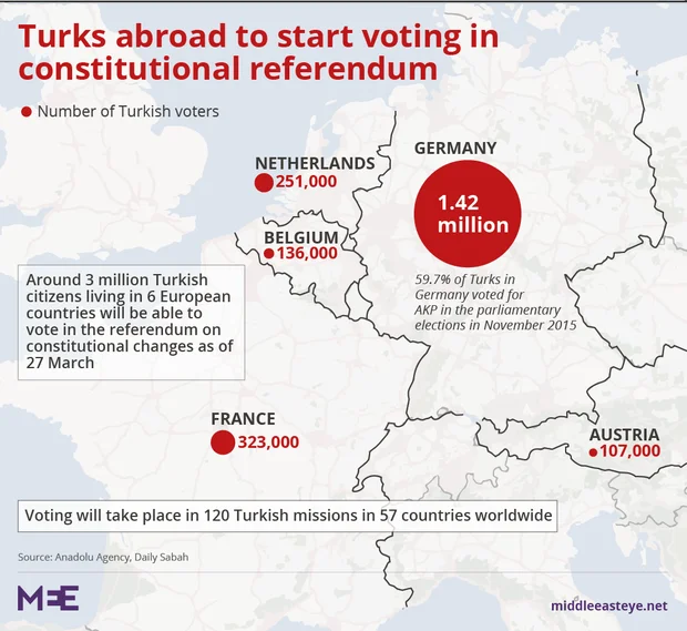 Turkish expats in Germany, Austria, Belgium, France, Switzerland, and Denmark went to the polls to vote on whether to grant extra powers to the Turkish presidency along with a host of other reforms. Turkey itself is set to vote on 16 April.