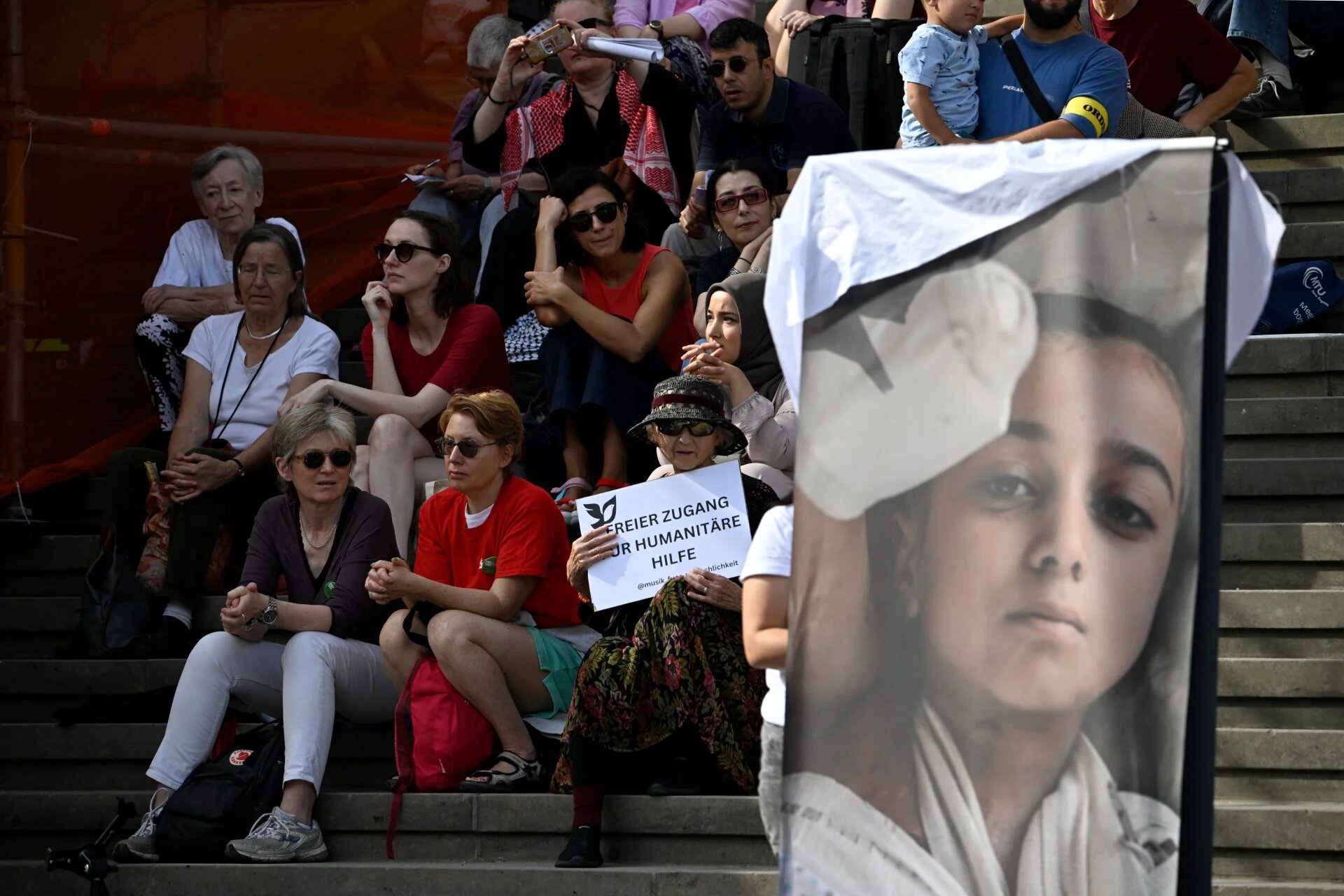 People listen during a classical concert in support of children in Gaza at the Gendarmenmarkt square in Berlin on 20 September 2025 (Tobias Schwarz/AFP)