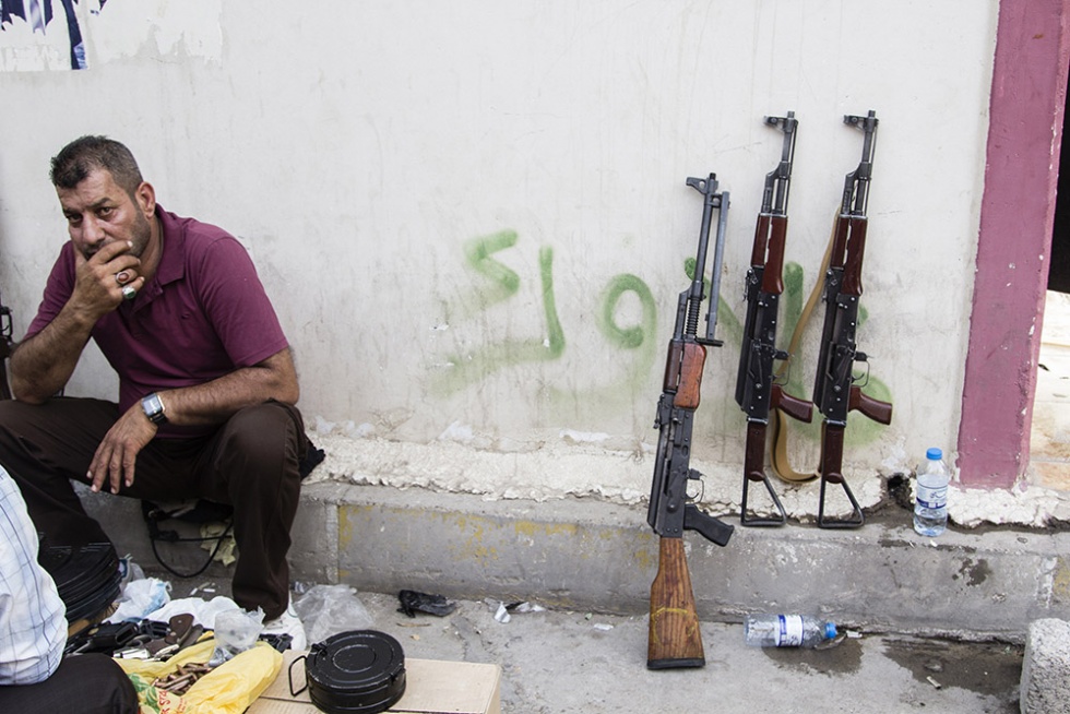 An agent who introduces himself as Shwan, 32, denies everything. Nobody here sells guns to civilians, he says. Only to peshmerga. To buy guns, you need a permit. It's all under control, he says. This is not Iraq, this is Kurdistan. Here there's law. The policeman next to him nods. Here there's law, he repeats. Although our photographer recognises him immediately: a few weeks ago his portrait was taken - exactly here. To make a living wage, he sells guns.