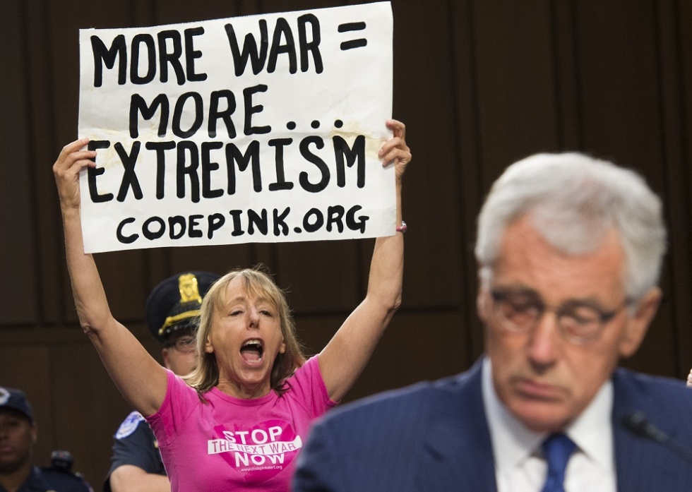 Hagel’s testimony was interrupted several times by protesters, who stood up to denounce the US aerial policy with shouts of: “You’re just breeding extremism!” The protesters from anti-war group Code Pink were then escorted out by police before Hagel could resume.