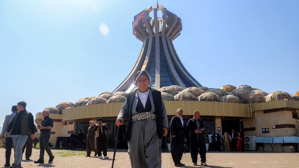 People walk outside the memorial to the 1988 Halabja chemical attack on 16 March (Shwan Mohammed/AFP)