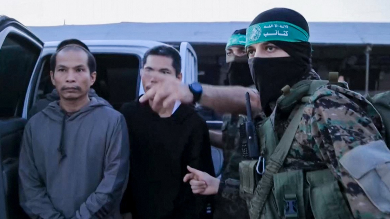 A video released by the Hamas media office shows members of the Qassam Brigades handing over hostages to officials from the International Committee of the Red Cross in Gaza on 24 November 2023 (Hamas Media Office/AFP)