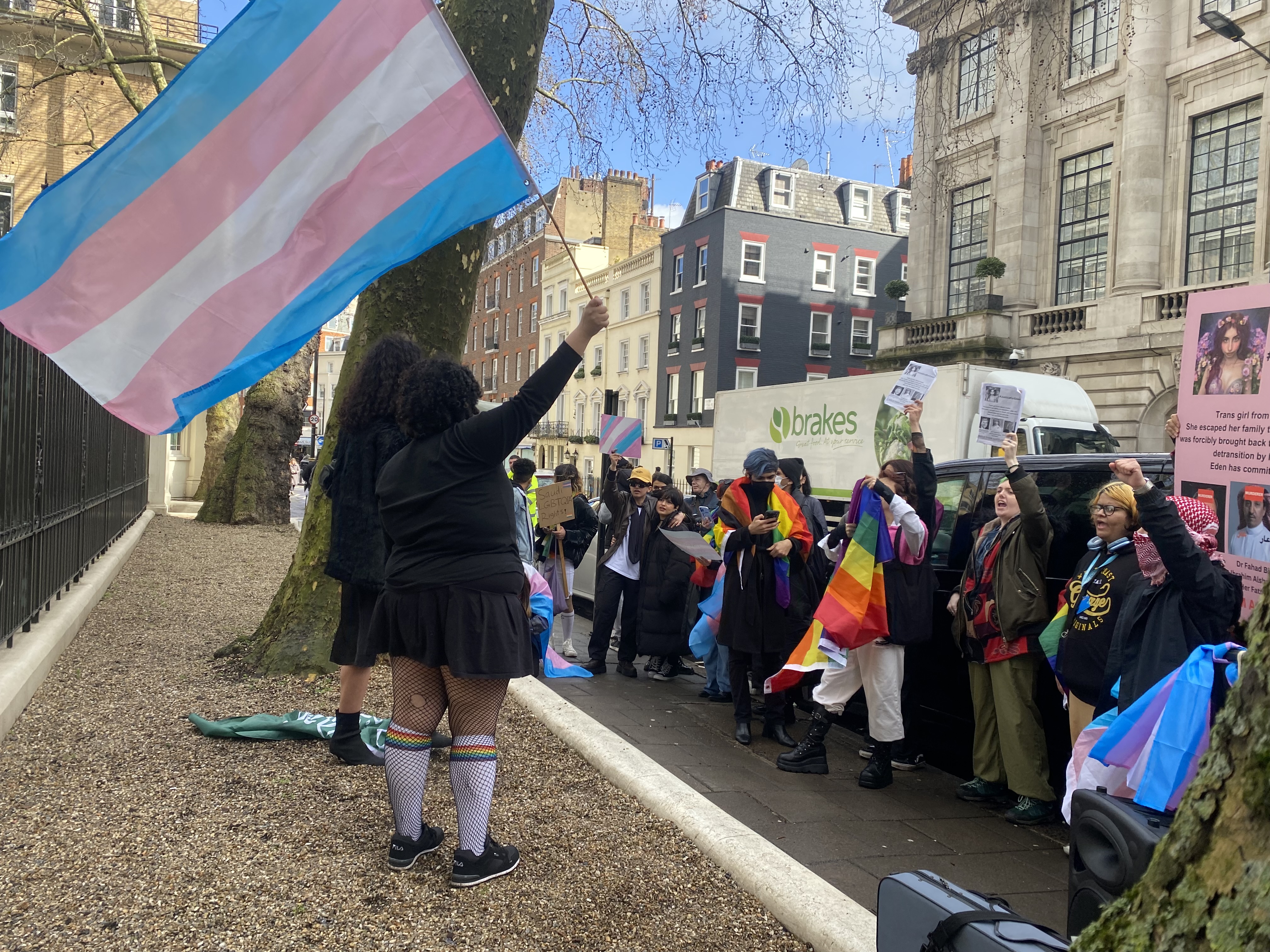 Dozens of friends and supporters of a Saudi transgender woman who killed herself this month after she said her parents lured her home and pressured her to detransition, protested in front of the Saudi embassy in London on Friday.