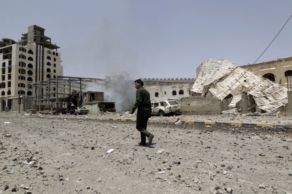 A Yemeni man walks on along a damaged street following a raid by Saudi-led coalition warplanes on a missile depot on Fajj Attan hill, in the rebel-held part of the Yemeni capital, in southern Sanaa (AFP)