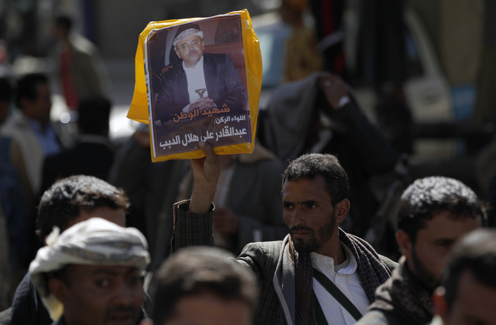 Yemeni mourners attend the funeral of Abdel Qader Hilal (portrait), the mayor of the capital Sanaa, on 10 October, 2016 after he was killed in an air strike on a funeral in the Yemeni capital (AFP)