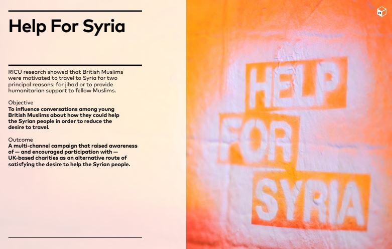 One example was RICU’s Help for Syria operation, which ran from 2013 to 2016: a website, Facebook page, YouTube channel and Twitter feed which appeared to be operated by a charity, but was actually run by RICU.