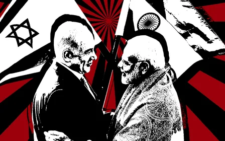 Bollywood has been wooed by Israel, with tax breaks, film funding and Benjamin Netanyahu's visit to Mumbai in 2018 (IIlustration by Mohamad Elaasar)