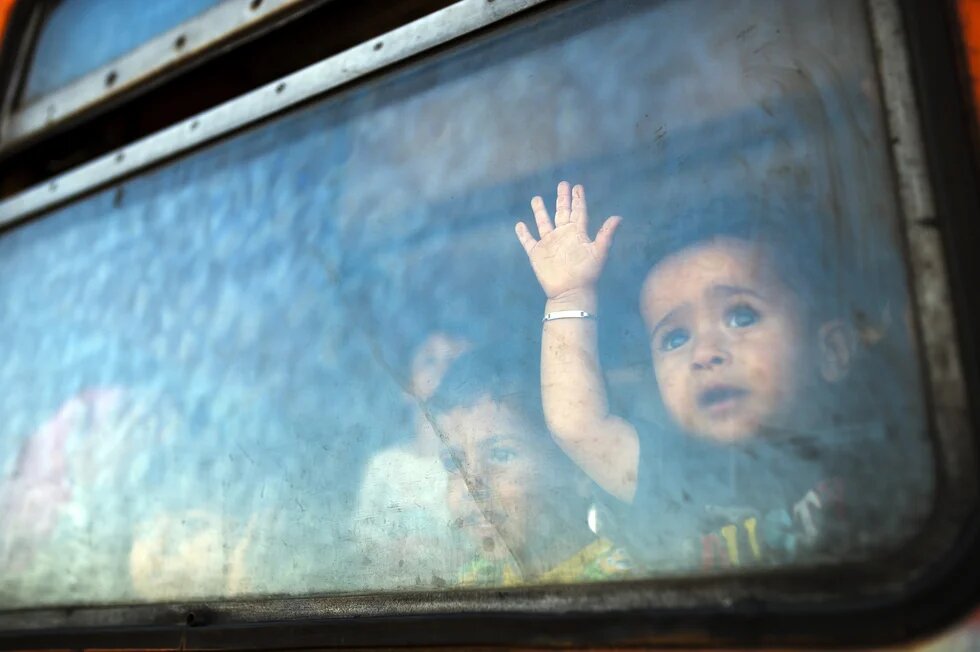 A refugee boy looks through a window onboard a train for Serbia (AFP)