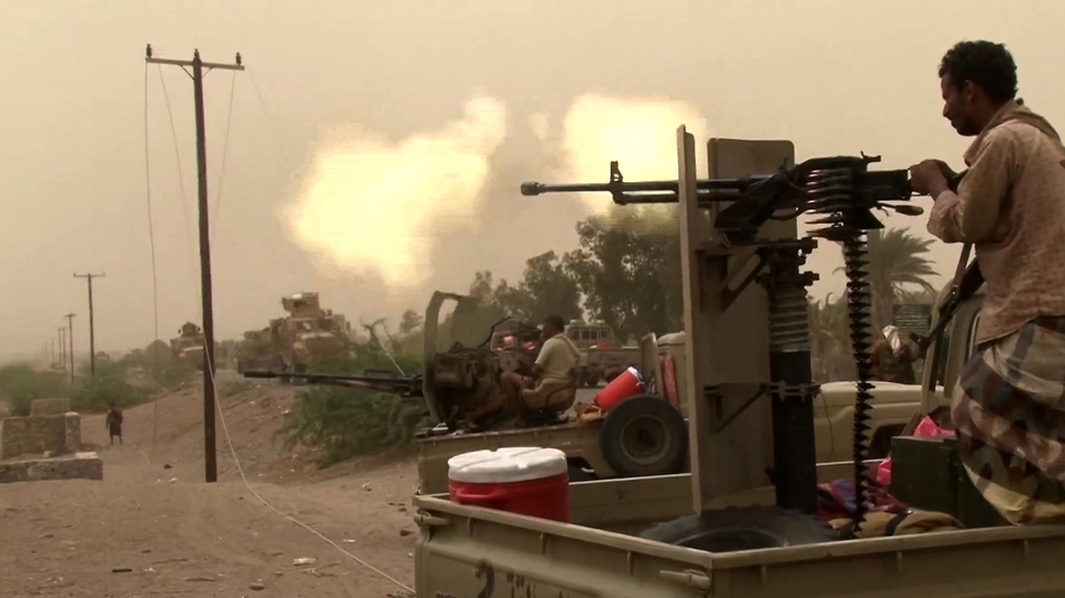 Yemeni pro-government forces fire a heavy machine gun to the south of Hodeidah airport in June 2018 (AFPTV screengrab)