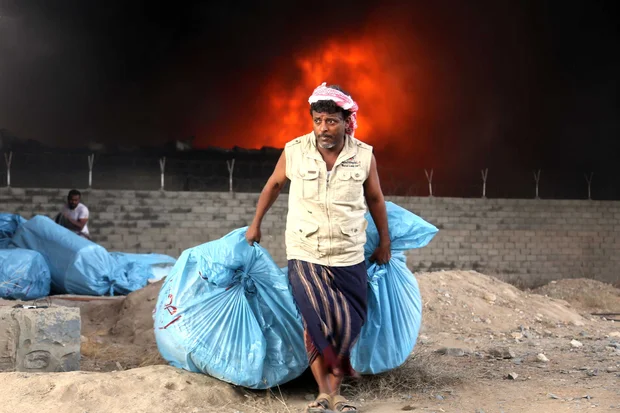 A Yemeni worker evacuates food as fire hits the UN's WFP warehouse in Hodeidah in March 2018 (AFP)