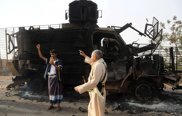 Yemenis check a vehicle after clashes between Houthis and pro-Hadi forces near Hodeidah in May 2018 (AFP)