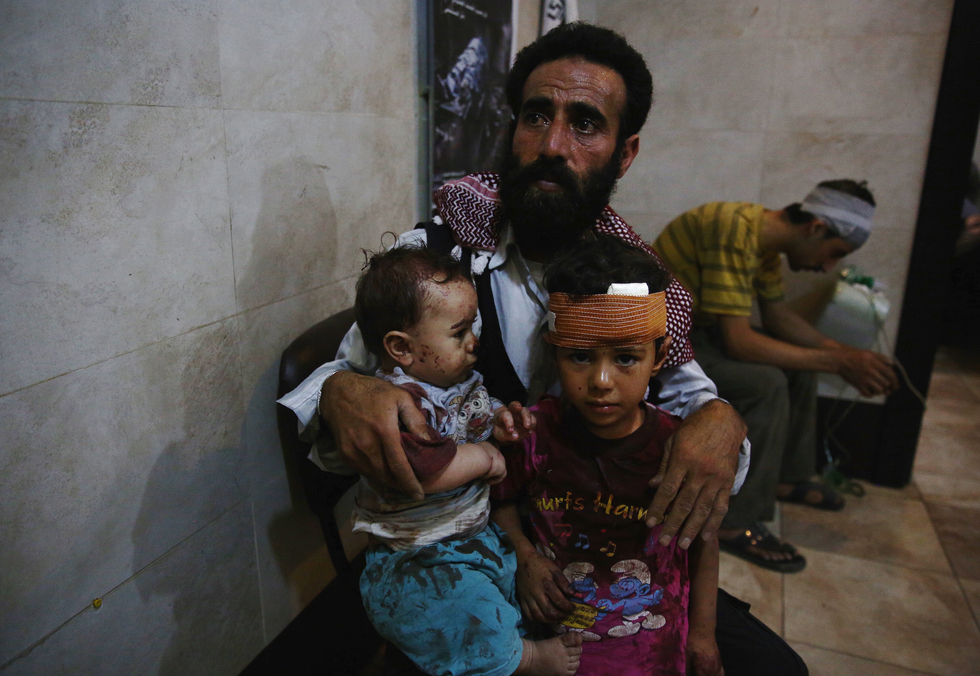 A Syrian man and two children wait to receive treatment at a make-shift hospital in Douma (AFP)