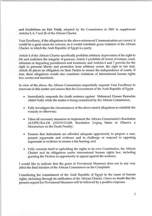 It added “considering the commitment of the Arab Republic of Egypt to the cause of human rights, including through its ratification of the African Charter, I have no doubt that the present request for Provisional Measures will be followed by a positive response.”