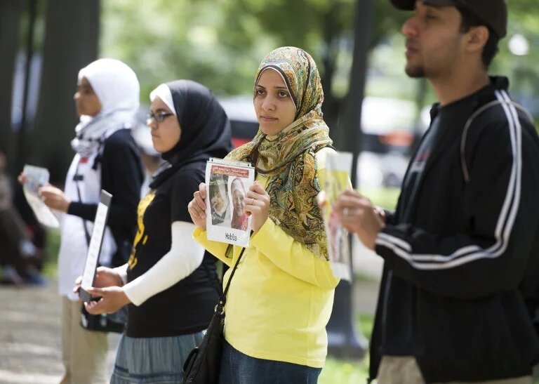 Demonstrators with Egyptian Americans for Democracy and Human Rights held in August to mark the one-year anniversary of the Rabaa Massacre in Cairo (AFP)