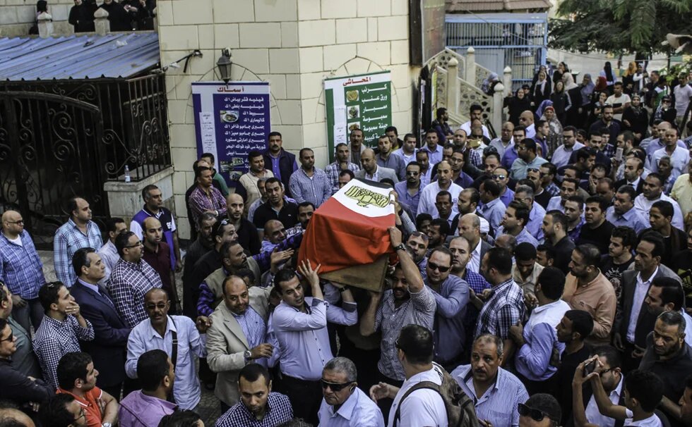 Mourners carried the coffins of police officers and conscripts who had been killed in an ambush on Friday in Egypt's Western Desert. Egyptian authorities said only 16 men had died when their patrol came under attack, but three security sources said the number was 52.