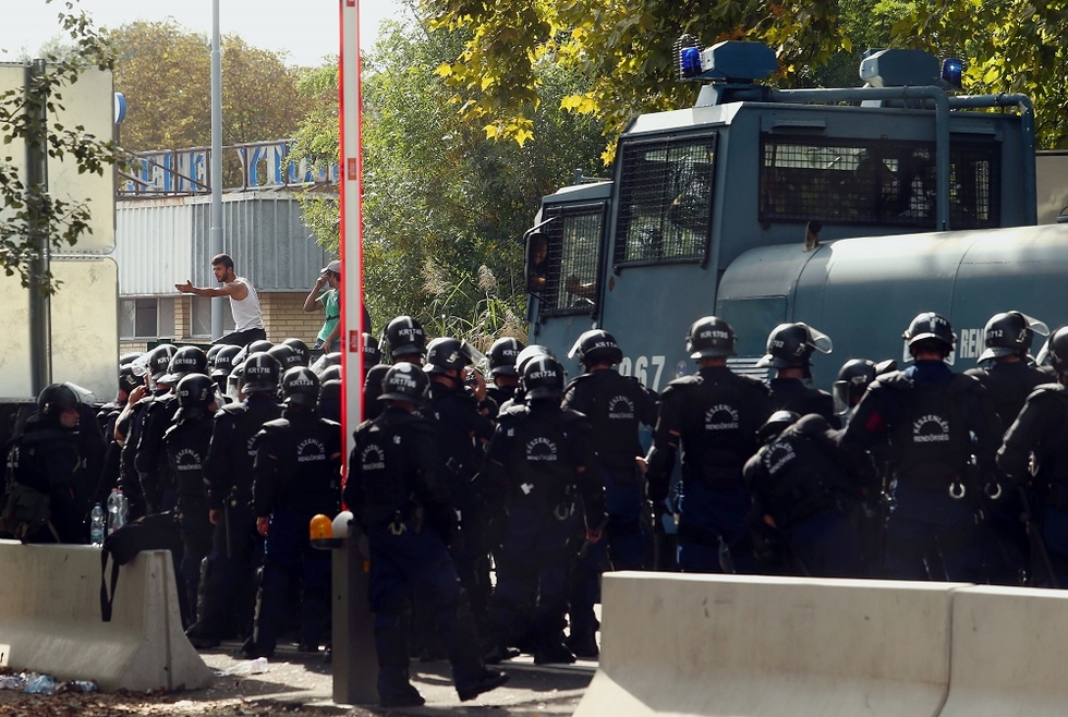 Hungarian riot police move in with water cannons as migrants attempt to break out of the no-man's land on Serbia border (AFP)