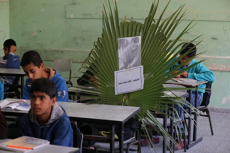 Class carried on with the names of the three boys put on palm fronds and laid on their chairs while thousands of Palestinians came out on the streets of Wadi al-Salqa for their funeral.