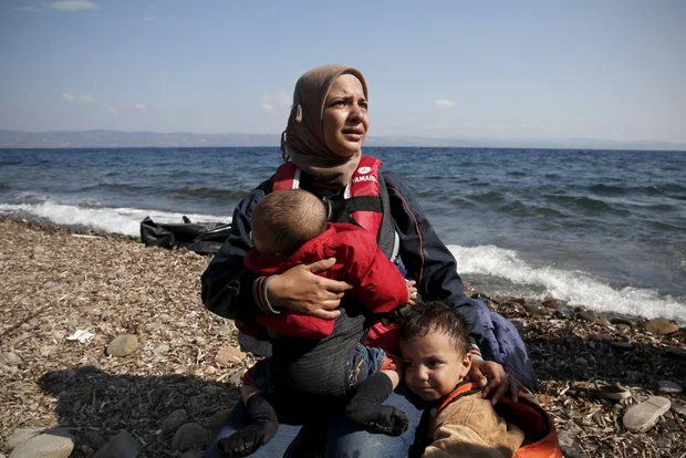 A Syrian woman cries while holding her children after arriving on a dinghy on the island of Lesbos, Greece in 2015 (Reuters)