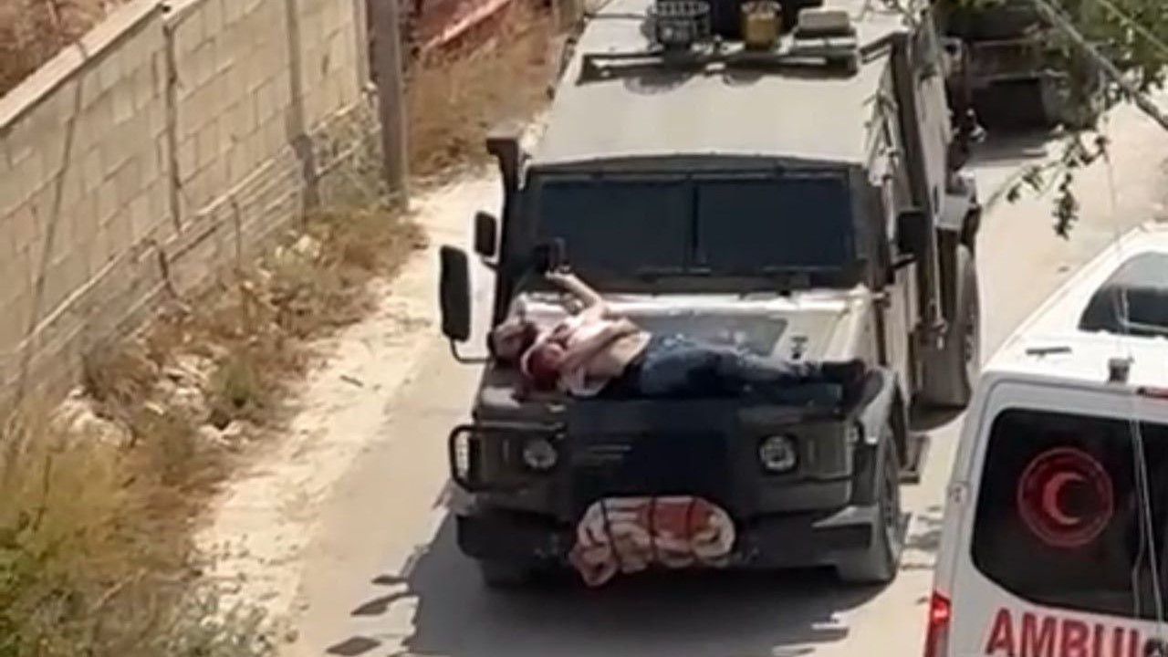 Abbadi can be seen strapped horizontally to the bonnet of a military jeep as it passes through a narrow alley in the West Bank city of Jenin.