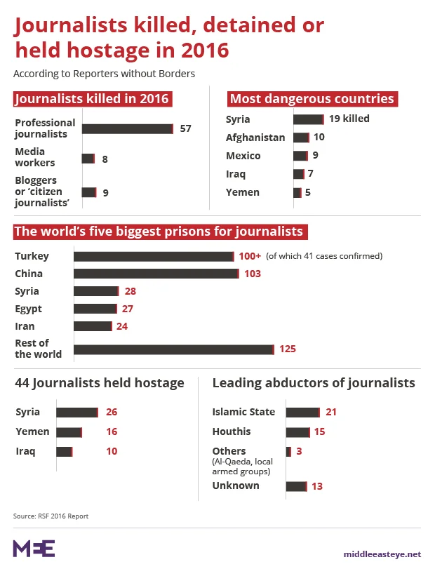 "A total of 52 journalists, all men, are currently held hostage worldwide, as against 61 on the same date last year," read the report, a figure including three citizen journalists and five media contributors."It should nonetheless be noted that the number of hostages in 2015 was exceptionally high, 35% more than the year before. This year, all the hostages are in the Middle East, in three war-torn countries. The immense majority are local journalists, often freelancers working for little money in extremely dangerous conditions."