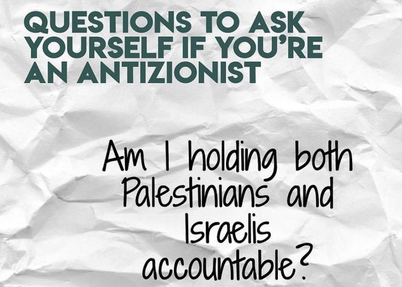 Anti-Zionists were called to check whether they are “speaking from a place of privilege”, if Palestinians and Israelis are both being held “accountable”, why the “only Jewish state” should be dissolved when there are “60+ Muslim and Chrisitian” states, and whether the conflict is being treated in the same way as other “conflicts, wars and human rights issues”.