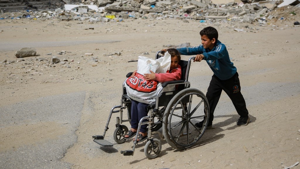A boy pushes a young girl in a wheelchair past a destroyed building in Gaza City, on 28 March 2024 (AFP)