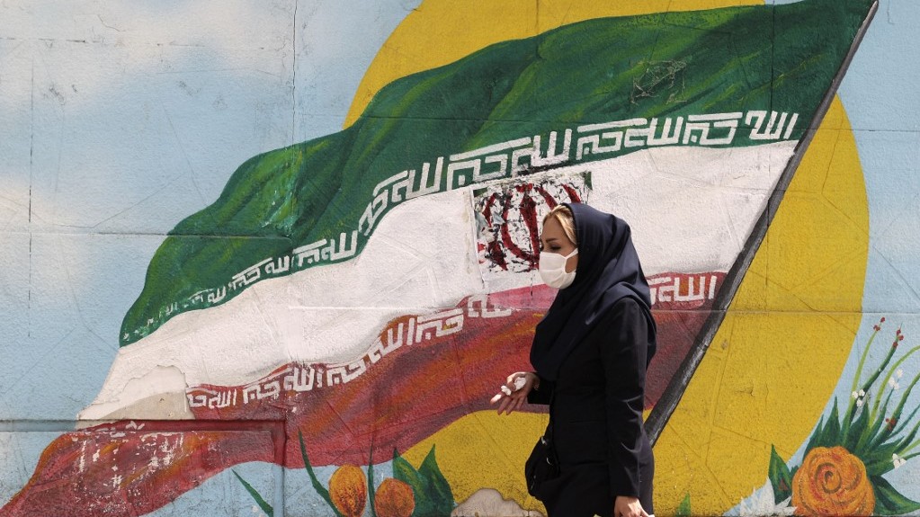 An Iranian woman walks past an Iranian flag painted on a wall in a street in Tehran, on 10 April 2023 (AFP)