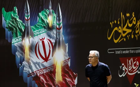 A man rides a motorbike past a billboard depicting Iranian ballistic missiles in service in Tehran on 19 April 2024 (AFP)