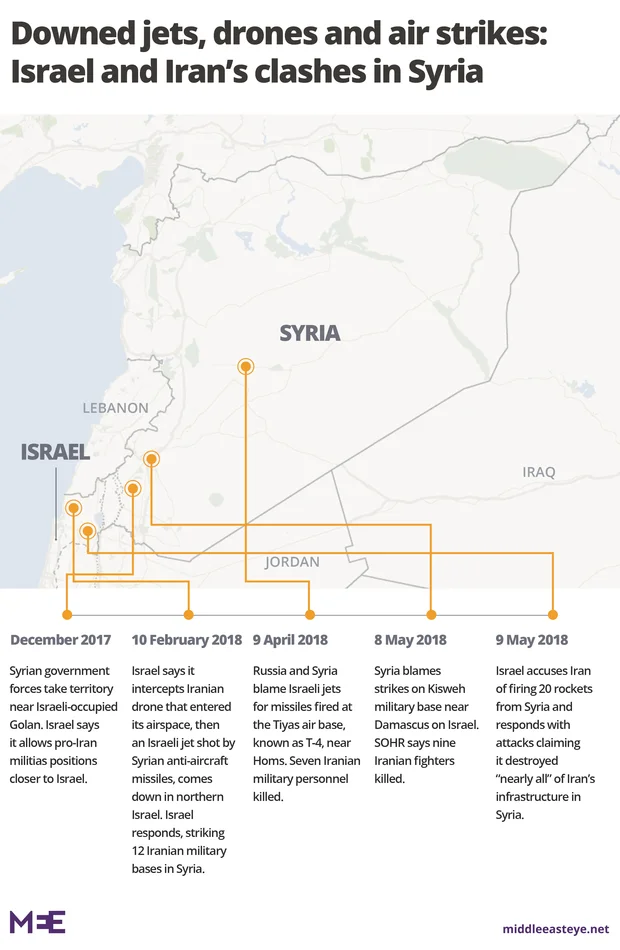 Israel said its strikes on sites throughout Syria were a response to 20 missiles targeting Israeli forces in the Golan Heights, which it blamed on Iran's Quds Force.