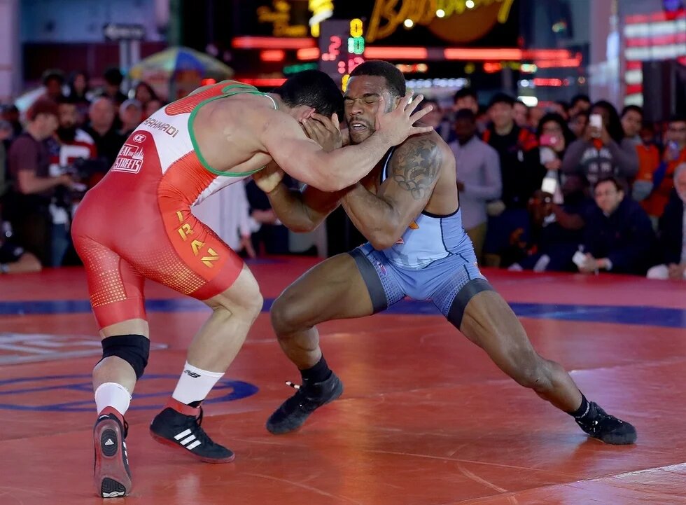 Jordan Burroughs of the USA and Peyman Yarahmadi of Iran during the 'United In The Square' Beat the Streets Wrestling in New York City, 19 May, 2016 (AFP)