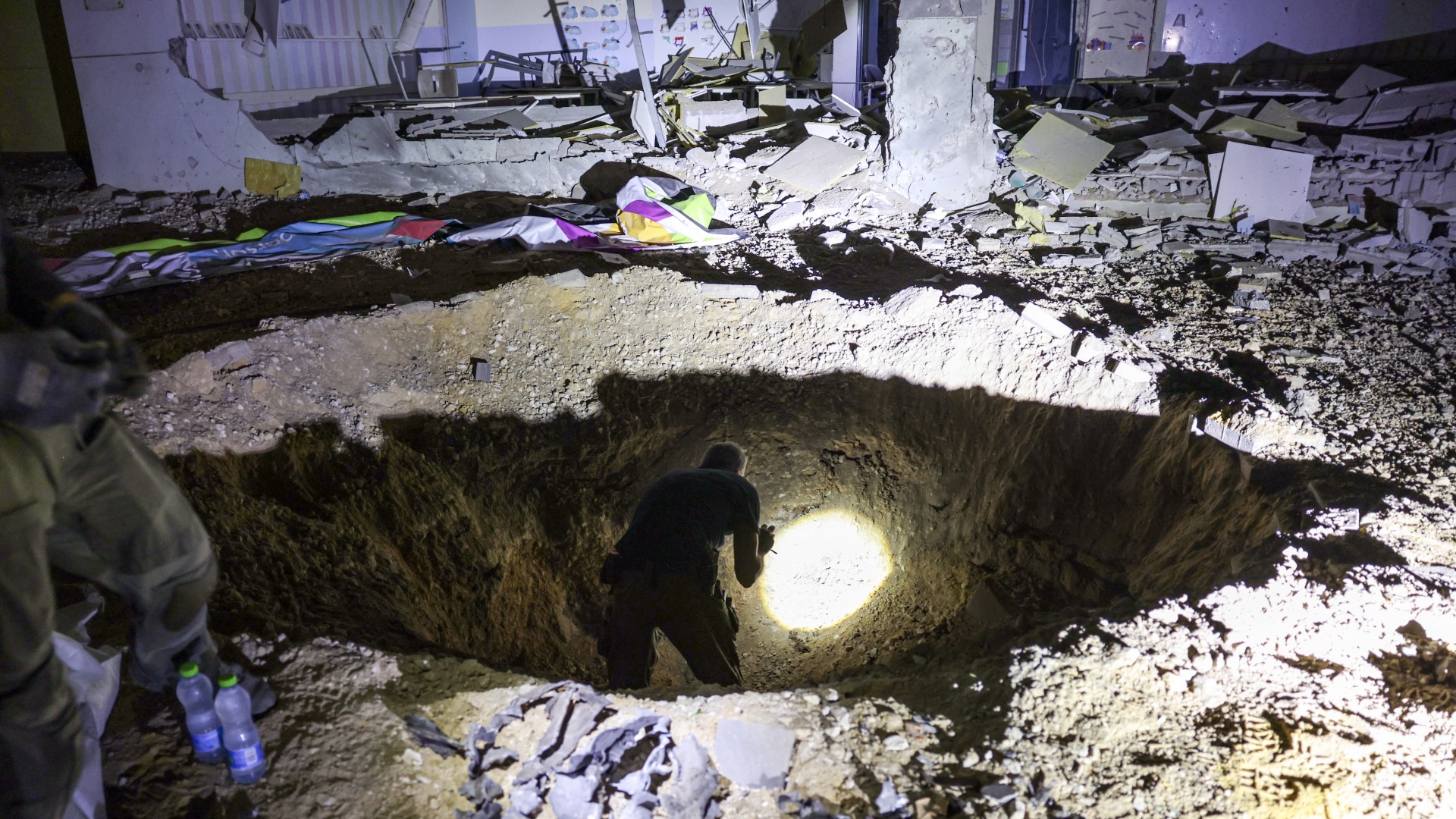 Israel's Home Front Command and police inspect a crater left by an exploded projectile at a damaged school building in Israel's southern city of Gedera on 1 October 2024 (Menahem Kahana/AFP)