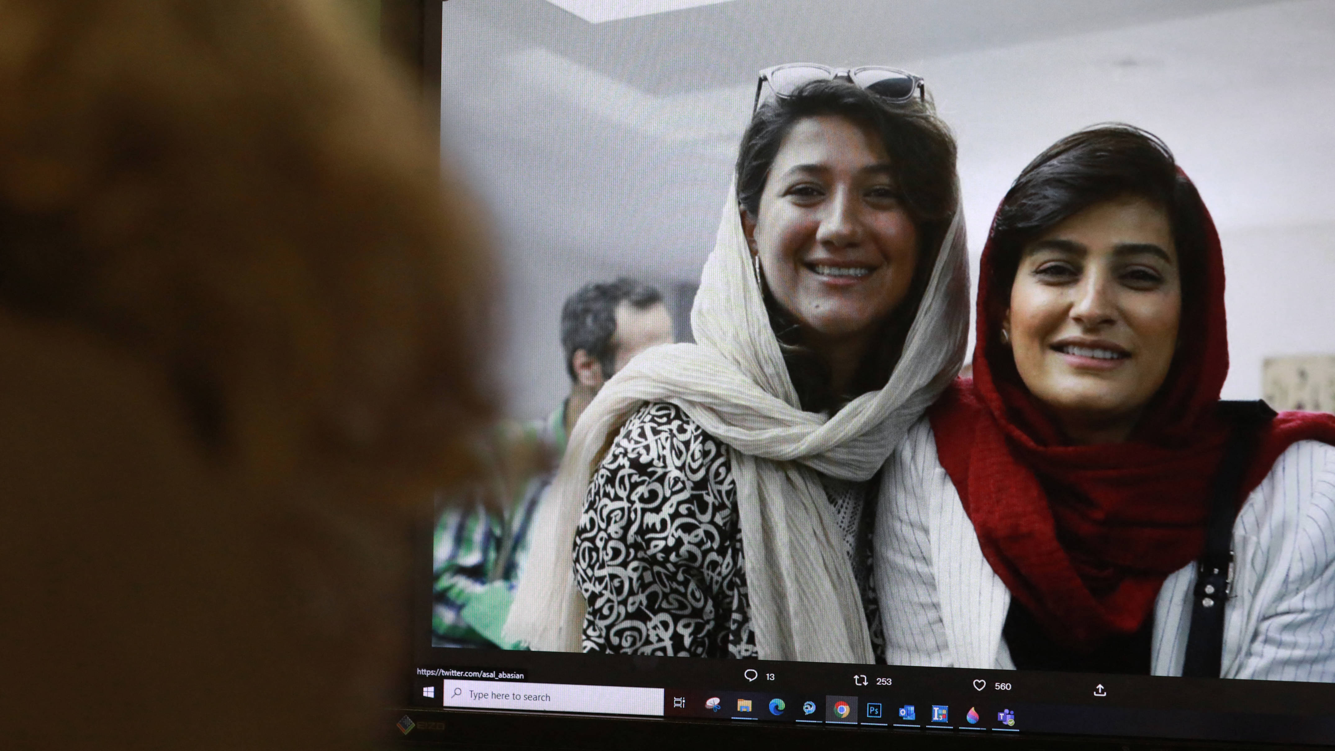 A woman looks at a picture of Iranian reporters Niloufar Hamedi and Elahe Mohammadi posted on Twitter, in Nicosia on 2 November 2022 (AFP)