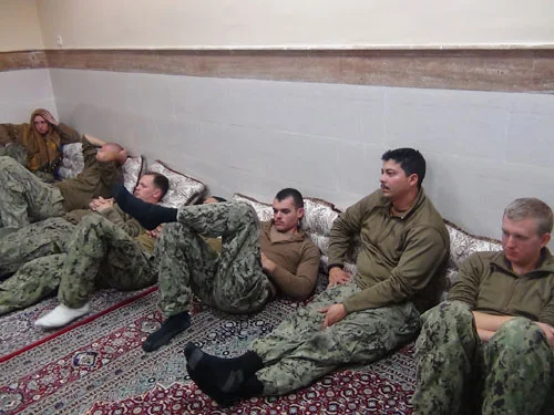 The images showed the group sitting together in a room on Persian rugs, with the one female sailor wearing a headscarf.