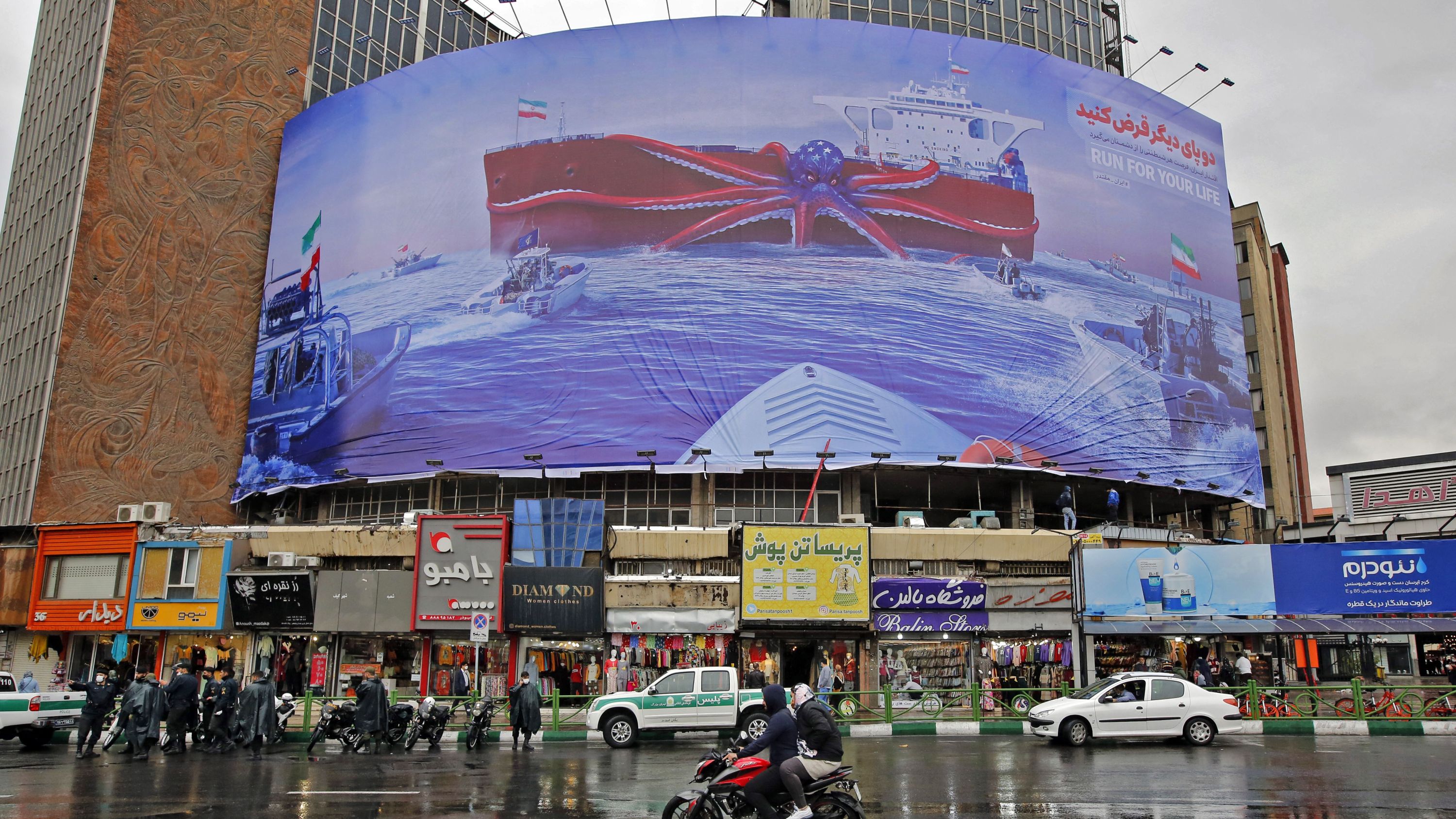 A billboard showing Iranian Revolutionary Guards Navy units observing a US warship in the Gulf of Oman is displayed at Vali-Asr Square in Tehran on 5 November 2021 (AFP)