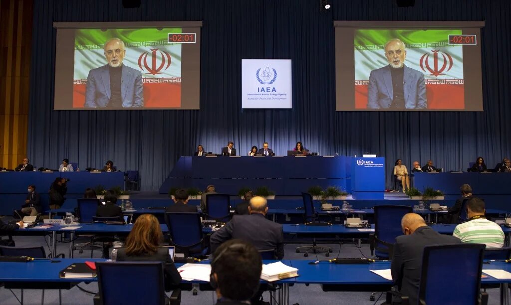 Iran's head of Atomic Energy Organisation, Ali Akbar Salehi, speaking on-screen at 64th General Conference of the International Atomic Energy Agency in Vienna on 21 September (AFP/File photo)