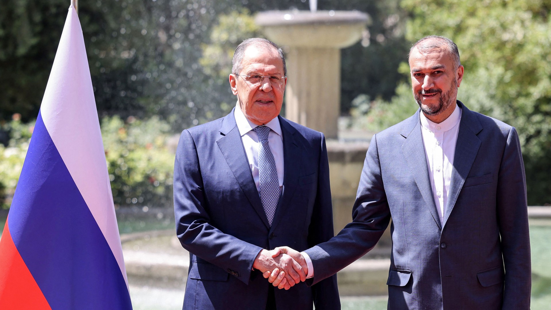 Iran's Foreign Minister Hossein Amir-Abdollahian (R) receives his Russian counterpart Sergei Lavrov at the foreign ministry headquarters in Iran's capital Tehran on 23 June 2022 (AFP)