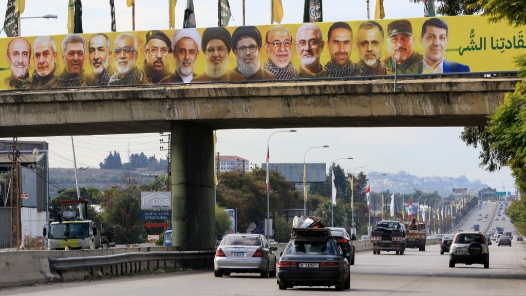 People returning to their villages in southern Lebanon, bearing pictures of the Hezbollah chain of command assassinated by Israel, on November 29 2024. (Mahmoud Zayyat / AFP)