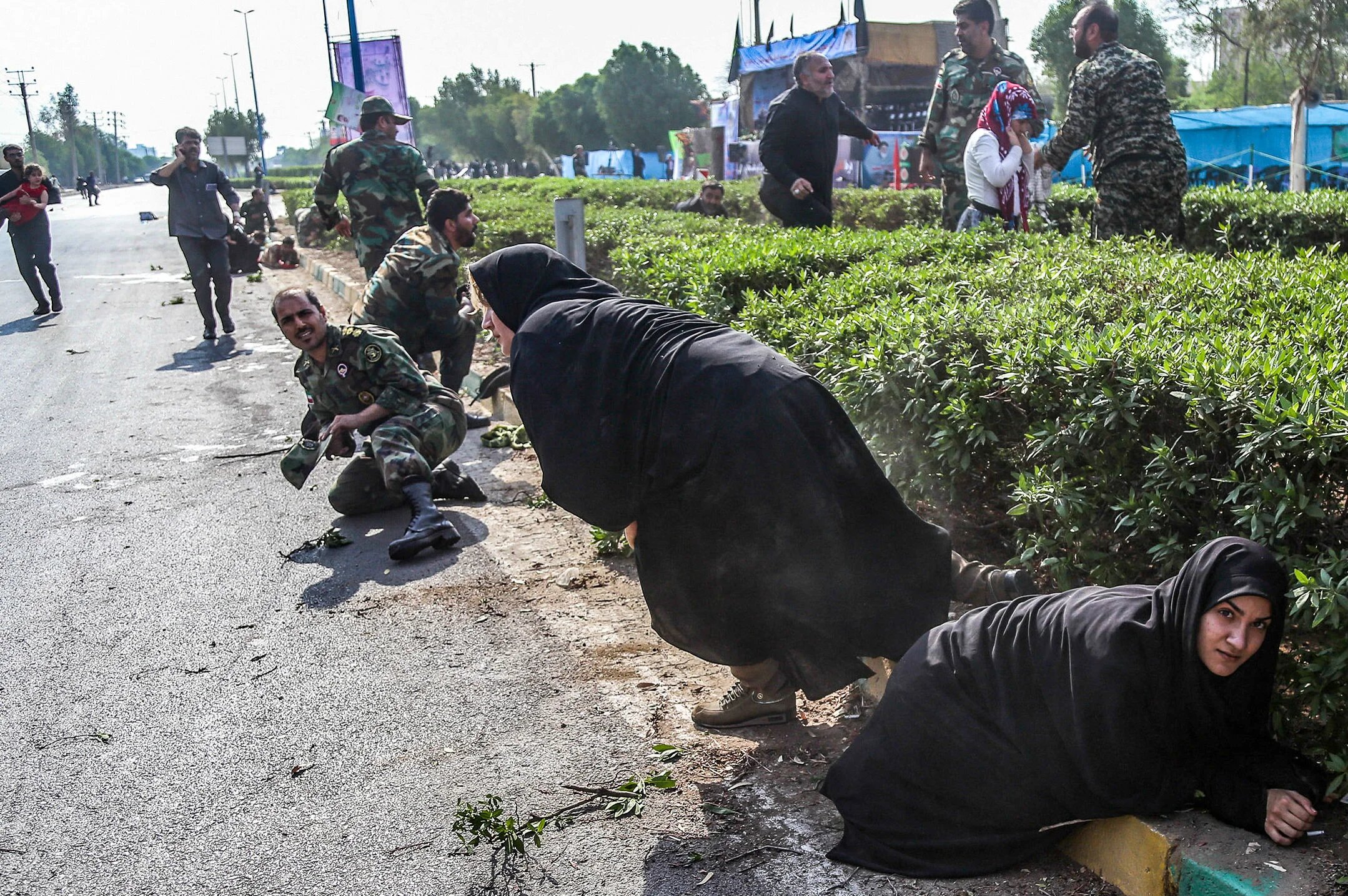 The pomp on display at a parade of Iranian Revolutionary Guards in the southwestern town of Ahvaz on Saturday was pierced by bullets as the spectacle came under attack, sending soldiers and spectators ducking to the ground.