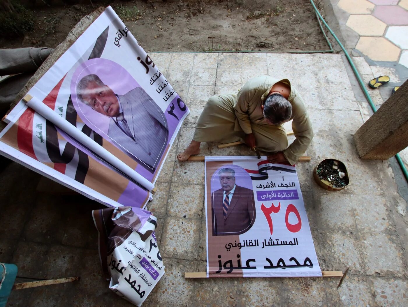 An Iraqi independent candidate prepares to hang his own electoral poster on 6 October 2021 in the central city of Najaf (AFP)