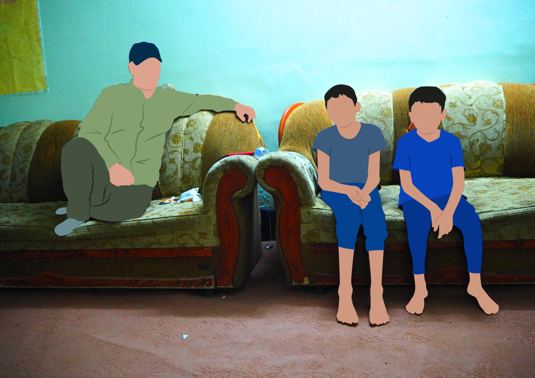 Photo: Brothers Ali, nine, and Ammar, seven, who spent five years with IS, sit with Haji Khalil Abu Muntadar, the local security chief of the Hashd al-Shaabi (MEE/Photo by Tom Westcott/Illustration by Mohamad Elaasar)