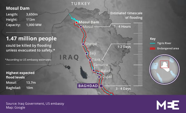 It said that Mosul could be inundated by more than 13 metres of water within hours of a breach and that downriver cities including Tikrit, Samarra and Baghdad would face lower but “still significant” levels of flooding within 24 to 72 hours.