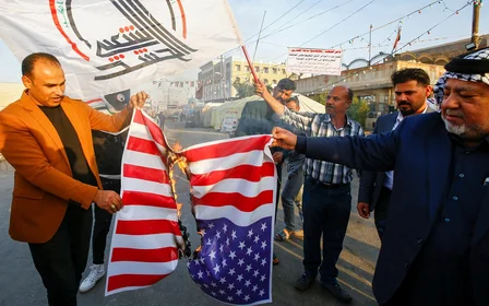 The demonstrators marched through checkpoints that usually restrict access to Baghdad's high-security Green Zone, chanting "Death to America", burning US flags and holding posters calling for the embassy to be shut down.