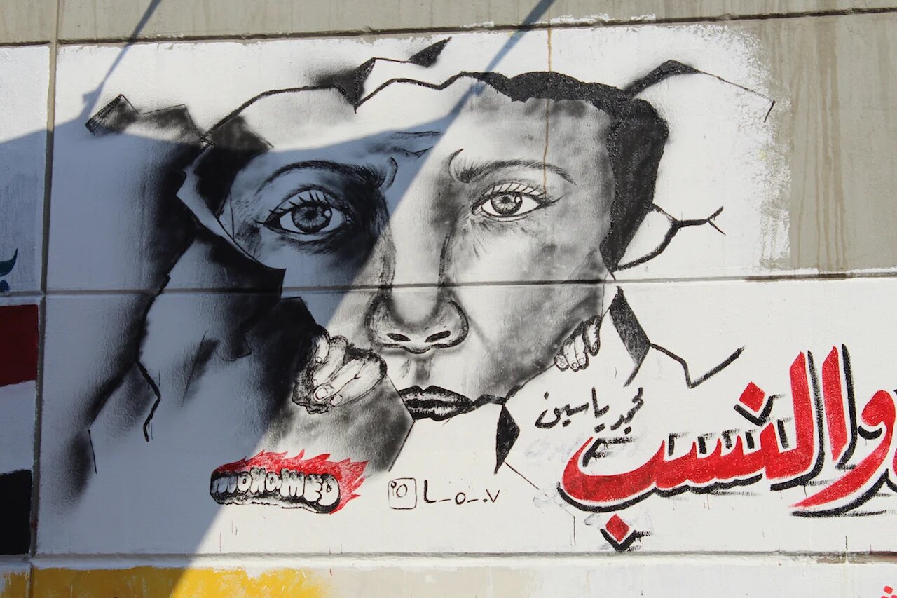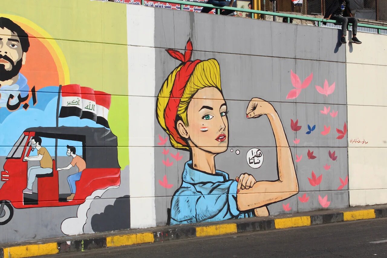 Unlike in many previous demonstrations, the October uprising in Iraq has seen a massive participation by women. A number of murals in Baghdad focus on the empowerment of women and their importance to the movement, with one pastiching the famous 'Rosy the Riveter' poster (MEE/Alex MacDonald)