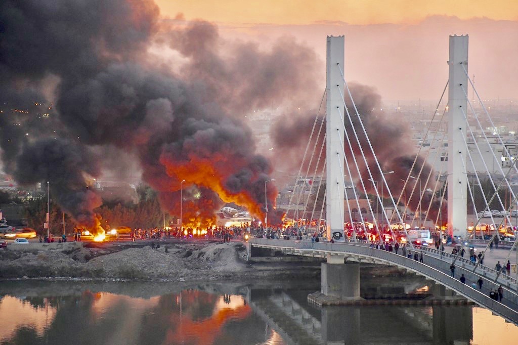 "This is only the first escalation," one protester in Baghdad with a scarf wrapped around his face told AFP as smoke from the tyres turned the sky behind him a charcoal grey.