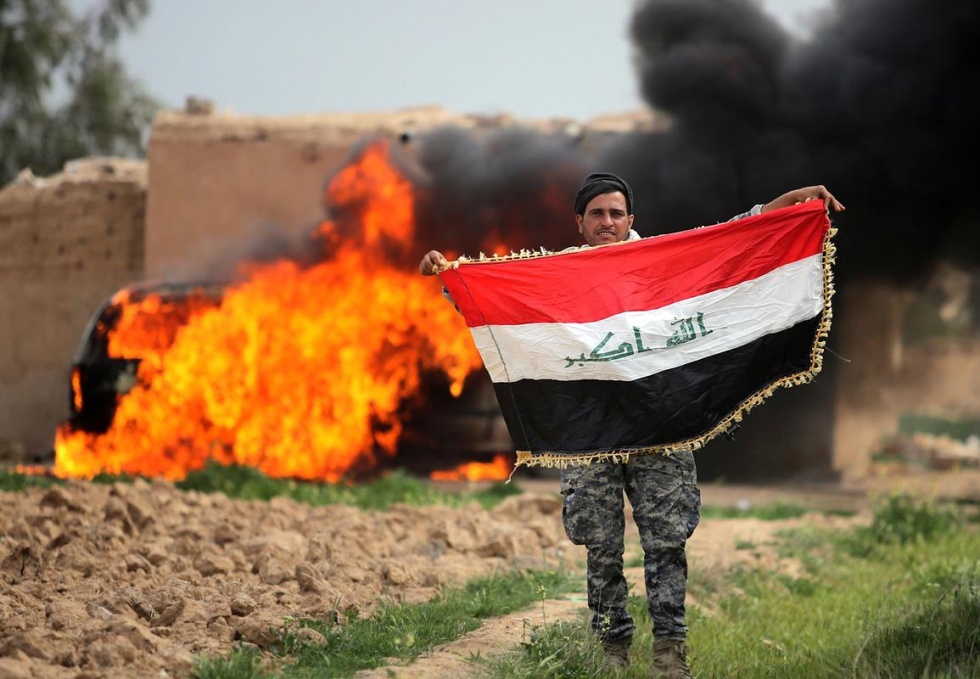 A member of Iraqi forces poses with an Iraq flag during clashes between Iraqi army forces and the Islamic State in Tikrit, Iraq on 9 March, 2015 (AA)