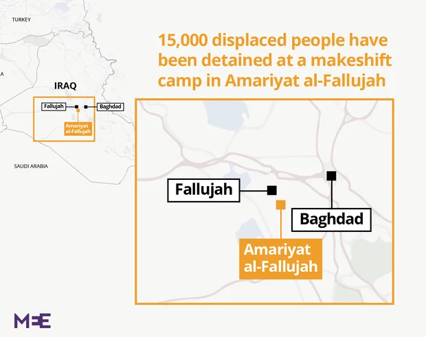 The council of Anbar province, of which Fallujah is the second biggest city, said 15,000 people who fled were being detained at a makeshift camp 30km to the south in Amariyat al-Fallujah while authorities carry out checks.