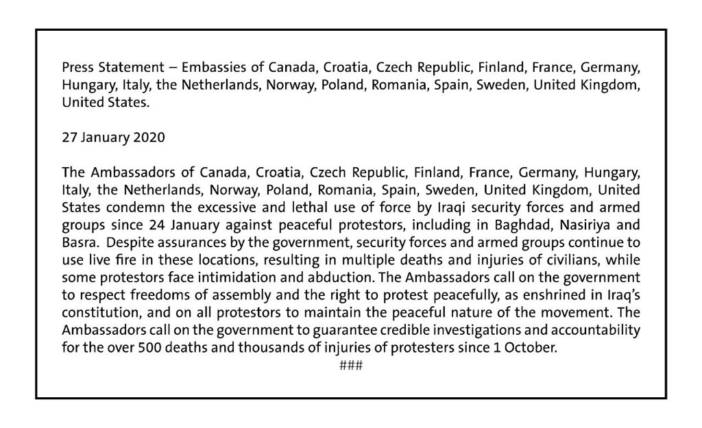 “The international community is about to internationalise the crackdown on Iraqi protests...after the statement of the 16 countries, and the steps moving towards achieving this goal as an international action," he said, referring to a letter signed by 16 countries on Monday condemning attacks on protesters.